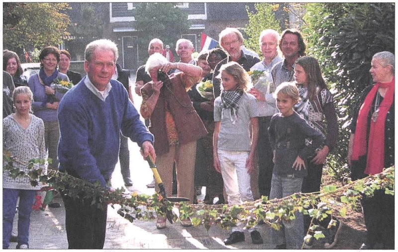 Wethouder Burema heropent het hofje door het doorknippen van een klimopslinger.