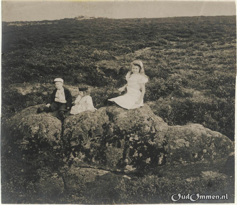 Kinderen van notaris Bloem, die begin 1900 eigenaar was van deze zwerfkei (groote steen) op de Lemelerberg.