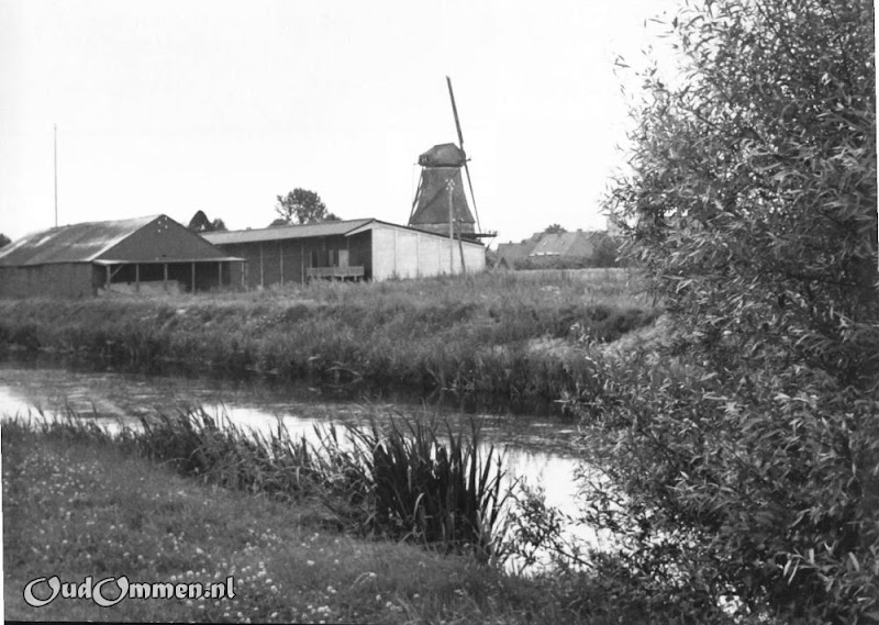 Dit is volgens mij het (voormalige) ommerkanaal ter hoogte van de molen de Lelie. De schuren die zichtbaar zijn, waren destijds in gebruik van de Cooperatieve aan en verkoopvereniging. Het voer en kunstmest werden per schip aangevoerd en ‘de Cooperatie’ had dus een opslag aan het kanaal.