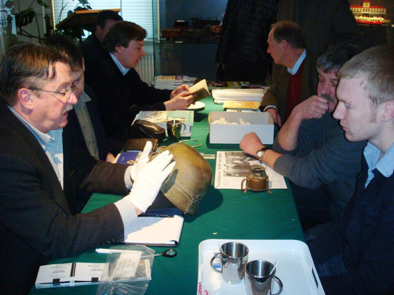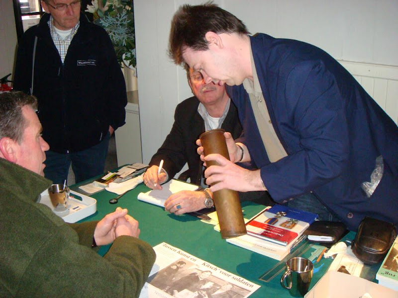 Foto’s, los of verzameld in fotoboeken waren ook de meeste voorwerpen die de legerexperts kregen te zien. Regelmatig klinkt het dan van: “Ze zijn van grootvader of van mijn vader. Hij is militair geweest”. De familie Ekkel uit Ommen laat een groot koperen kruik zien, die van huls is omgebouwd tot beddekruik. Een familie uit Mariënberg is in het bezit van een vijftig tal koperen emblemen. Ook is iemand naar het museum gekomen met een oude revolver en een steekwapen en krijgt uitgelegd dat beide wapens volgens de wapenwet verboden zijn. “Wat zijn ze dan waard”, wil meneer nog weten. “Niks, omdat ze verboden zijn”, luidt het antwoord. Fraai exemplaar wordt ook getoond van een oude legerhelm. Aan de hand van het model wordt uitgelegd wanneer het gemaakt is. De trotse bezitter heeft het gekocht voor 160 euro en wilde van de experts weten welk onderdeel van het leger er ooit mee getooid is geweest