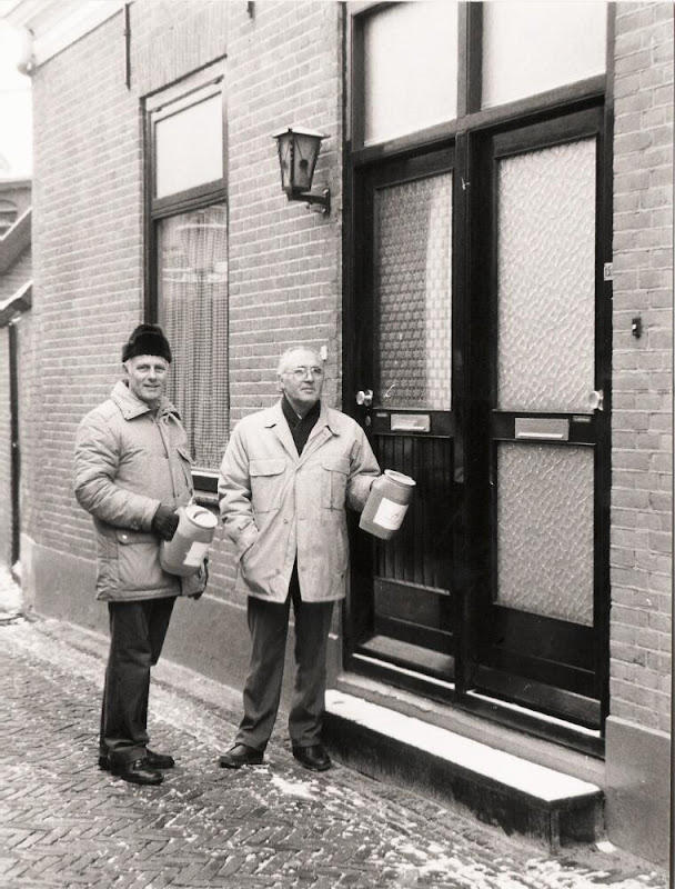 Huis-aan-huis geldinzamelingsactie voor de ijsvereniging, op de foto Egbert Boezelman en Frans Masselink