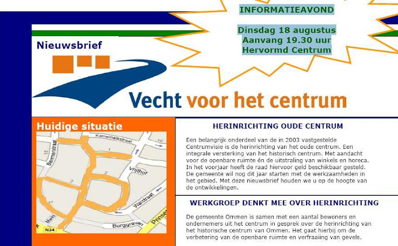 Samen met een werkgroep (bestaande uit inwoners/ondernemers uit het centrum) is er de afgelopen maanden gewerkt aan de invulling van de openbare ruimte en de uitstraling van winkels en horeca. De resultaten hiervan staan in het concept inrichtingsplan. De gemeente nodigt belangstellenden uit voor een informatieavond op dinsdag 18 augustus 2009 in het Hervormd Centrum. De avond begint om 19.30 uur. De zaal is open vanaf 19.00 uur. Meer informatie over de herinrichting kunt u vinden op http://www.vechtvoorhetcentrum.nl.