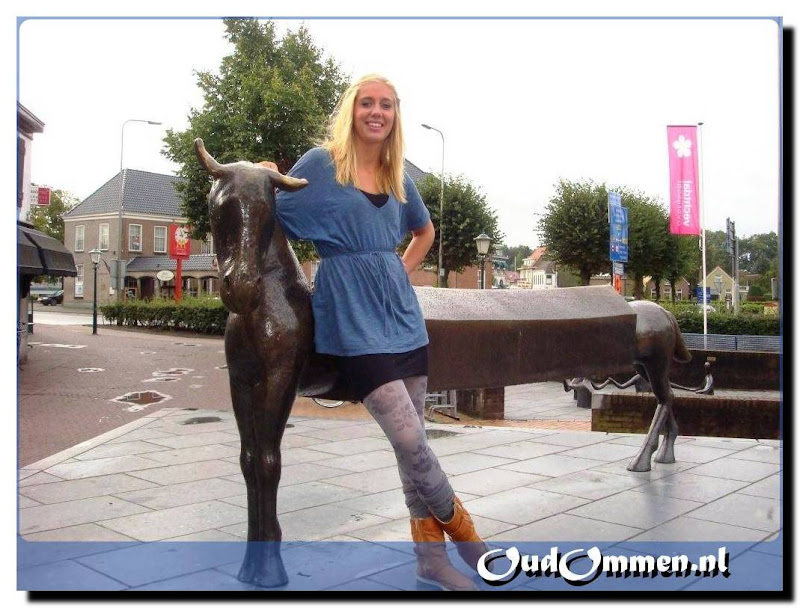 Emmelie Luiken bij een historisch kunstwerk op de Markt.