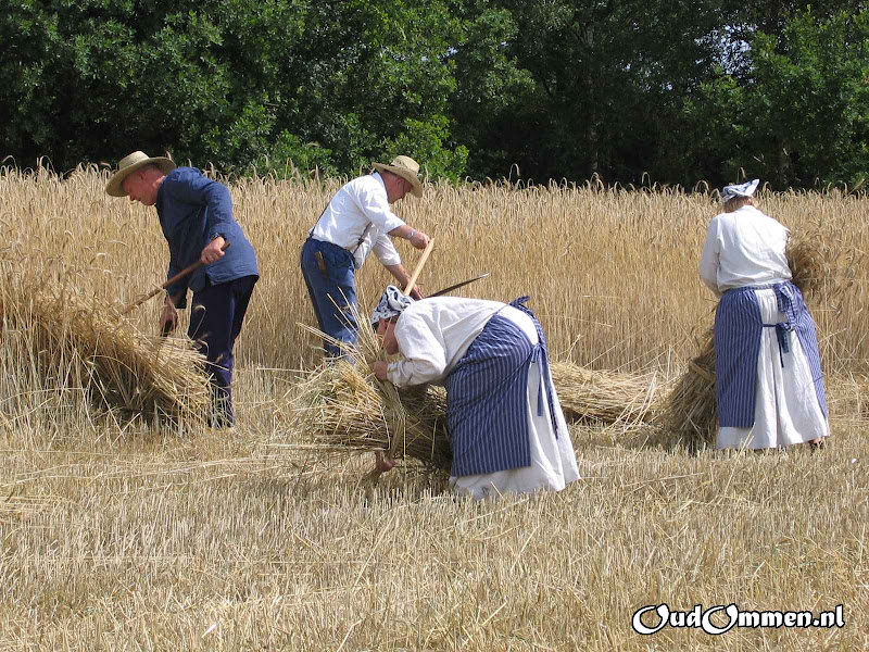 Vele bezoekers bekeken de in klederdracht gehulde ‘boeren en boerinnen’ die graan en aan het oogsten en dorsen waren.
