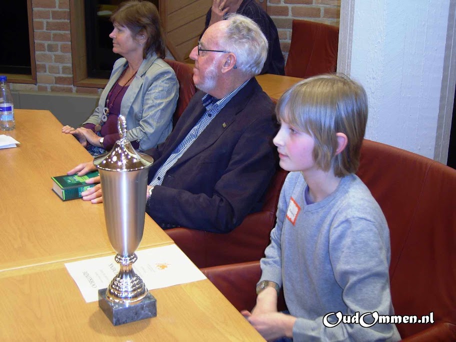 En toen was er nog de barrage: ijzingwekkend, ijzeroxide, eindexamenvak, Lorenzo, Fleur en Tijl maakten geen enkele fout. Wethouder Scheele zag al nachtwerk in het verschiet maar de woorden ijzelen en enquête brachten de uiteindelijke winnaar. Wethouder Scheele reikte vervolgens de prijzen, waaronder de wisselbeker, uit en was zeer content met het hoge niveau van de deelnemers. Tijl Bleumink en Fleur Nijenhuis vertegenwoordigen op 17 april Ommen in de provinciale finale in Nijverdal. Daar nemen ze het op tegen een twintigtal kandidaten uit andere gemeenten in Overijssel. De deelnemers aan het Junior Dictee waren: Fleur Nijenhuis en Tijl Bleumink van OBS Dennenkamp, Victor Goossens en Benthe Kraaijvanger van OBS Nieuwe Brug, Rachel Merjenburgh en Jarno Vogelzang van de Guido de Bresschool, Talitha Swets en Sanne Hirink van CBS Hoogengraven, Lotte Hakkert en Lorenzo Honer van de RKBS St. Bernardus, Anwar Boussajra en Fleur Nij Bijvank van OBS Het Palet en Merle Flim van CBS Ichthus uit Lemele. De organisatie van het Junior Dictee was in handen van Bibliotheek Ommen.