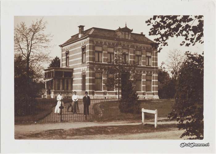 1905. Burgemeester jhr J.L. van Nahuijs (rechts) en in het midden zijn echtgenote H.J. van Nahuijs-Ampt voor villa Hei en Dennen aan de grindweg naar Hellendoorn in Besthmen; tegenwoordig Hammerweg 14, Ommen.