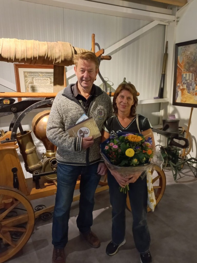 Uiteraard waren ze zeer verrast toen ze uit handen van de museumvrijwilligers, Gerrit Steen en Erik Lamberts, 2 boeken en een prachtig boeket bloemen kregen overhandigd.