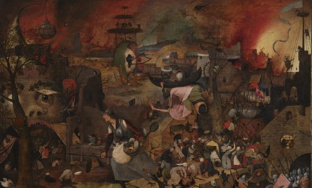 Het is behoedzaam bewegen in de werkelijkheid van de zestiende-eeuwse schilder Pieter Bruegel de Oude. Vreemde figuren kruisen je pad. We zien een galgenveld. Krakende skeletten nemen de heerschappij over. Afzichtelijke stinkende wezens wervelen in een gierende storm uit de hemel.