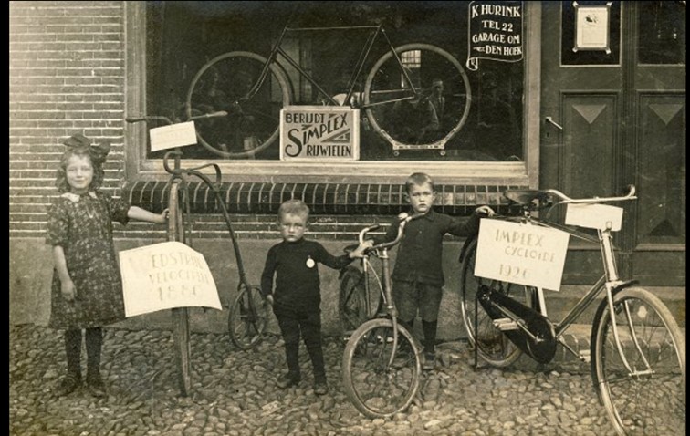 1926. Truus, Bertus en Arie Hurink voor de fietsenwinkel aan de Markt. Als je de hoek om ging kwam je in de garage