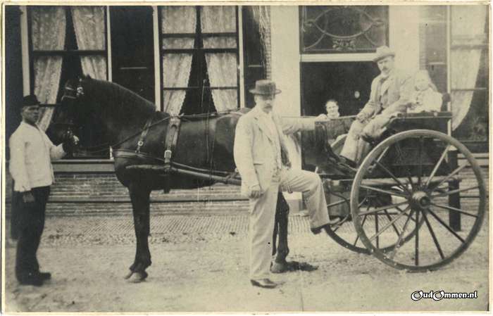 1902. Dokter Carel Johan Warnsinck met paard en rijtuig op weg naar een patiënt. Voor het paard staat stalknecht R. Bosscher. Verder op de foto een broer van de dokter, die zijn praktijk wel eens waarnam. In het wagentje dokter Warnsinck met zijn dochter. In de deuropening kijkt mevrouw P.H. Warnsinck-Bouwmeester toe.