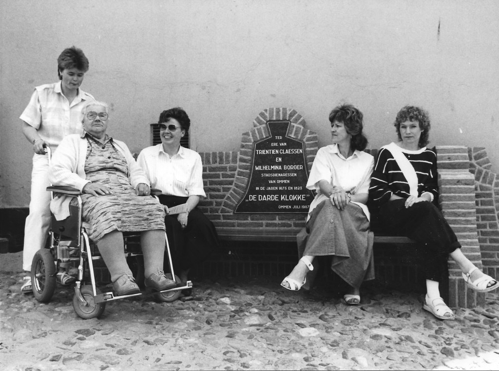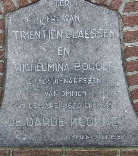 De geschiedenis leert dat ook vrouwen de functie van stadsdienaar bekleedde. Ter ere van deze geëmancipeerde vrouwen plaatste in 1989 de Stichting de Darde Klokke een stenen zitbank naast het klokkenhuis op het Kerkplein. De herinneringsbank – met vormen van een luidklok – werd op 4 juli 1989 officieel in gebruik genomen door vijf vrouwen uit Ommen. “Ter ere van Trientien Claessen en Wilhelmina Borger, stadsdienaressen van Ommen in de jaren 1675 en 1823”. Een eerbetoon omdat zij als ambtenaren typische mannenfuncties uitoefenden. Wilhelmina Borger was de dochter van een bewaker in bedelaarskolonie de Ommerschans. Misschien trad deze kranige dame in het voetspoor van haar vader. Ironisch genoeg kwam de erebank voor deze twee vrouwen in de plaats van een openbaar herenurinoir.