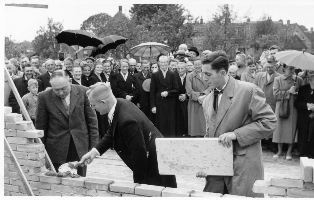 Vele kerkleden kijken toe hoe op 10 september 1957 de officiële steenlegging plaats vindt door ds. R. te Velde (midden), daarbij geholpen door de architect E. Reitsma (links) en de aannemer. Noot: Helemaal achteraan is te zien dat burgemeester Van Reeuwijk (met hoed) het jongste dochtertje van de dominee optilt.