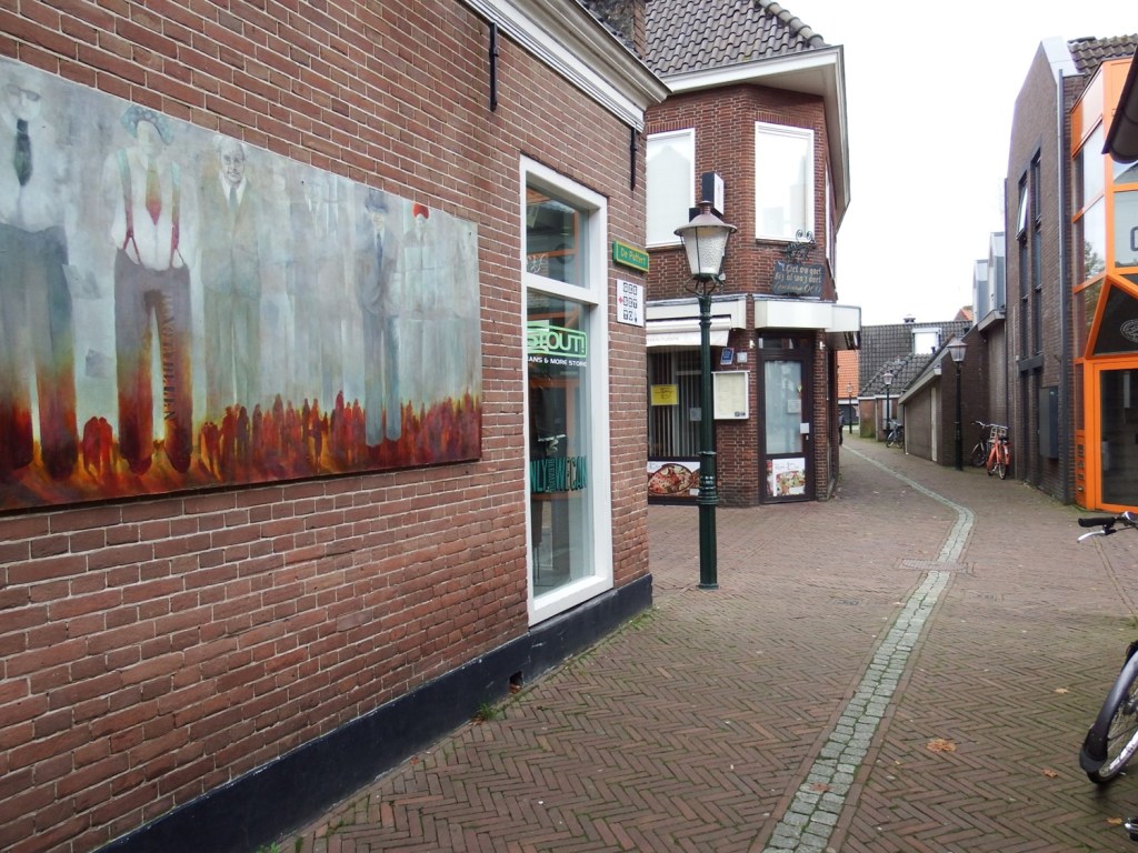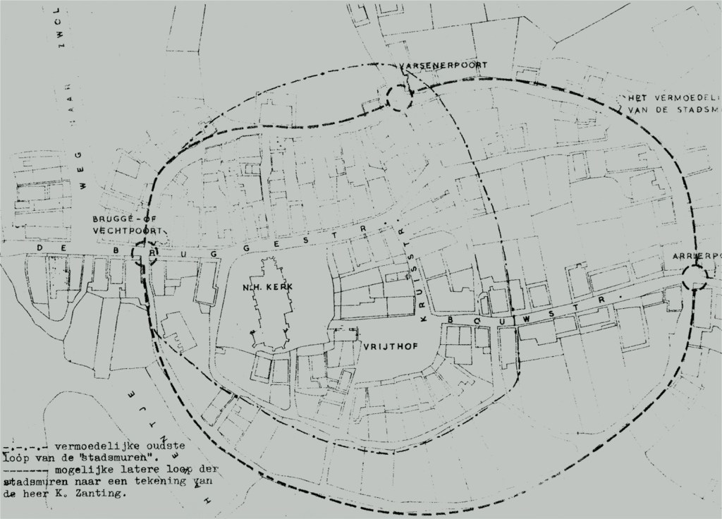 De plek (Brugstraat/De Poffert,) waar ooit de Bruggepoort stond met de stadsmuur, is hier gemarkeerd met een lijn in de bestrating.