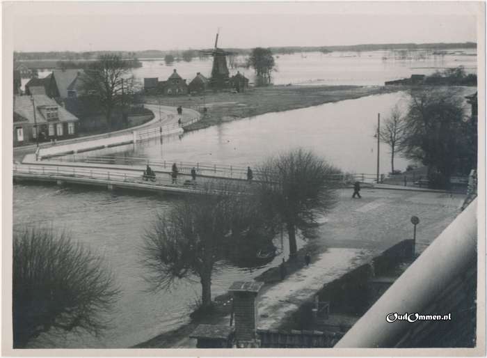 1946. De Vecht in Ommen met hoog water. Achter is molen Den Oord te zien en op de voorgrond de brug over de Vecht