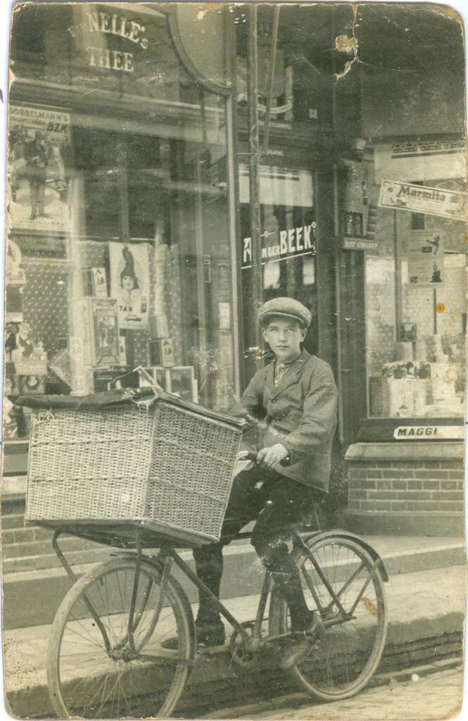 1935. Van der Beek zorgde er ook voor dat de boodschappen aan huis werden bezorgd. Een boodschappenjongen voor de zaak. De Brugstraat ligt zo te zien aanzienlijk lager dan de entree. (foto: beeldbank CCO)