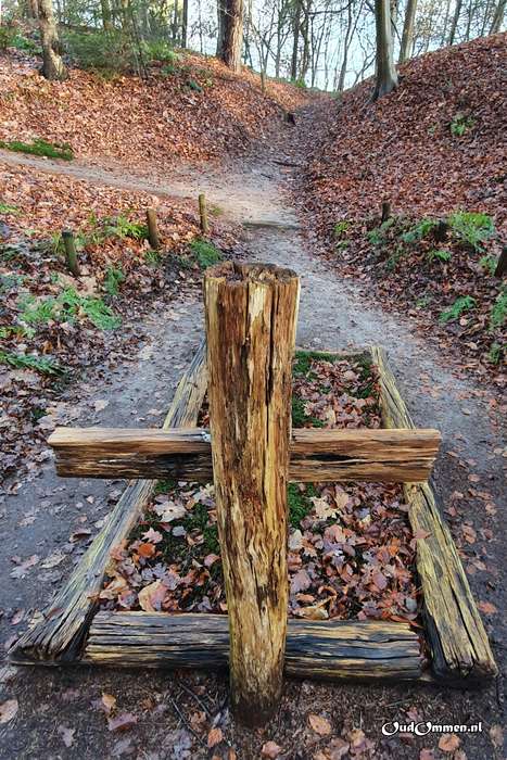 In een dalletje achter de hut ligt ook nog een zogenaamd ‘graf’ van de kluizenaar, voorzien van een ruw houten kruis. Als verhaal doet de combinatie van kluizenaarshut en kluizenaarsgraf het wel goed op een wandeling over de kronkelpaden van het landgoed…!