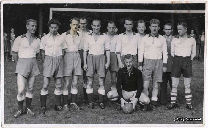 1948. Het eerste team v.v. Ommen: v.l.n.r. B. v.d. Boon; W. de Wit; J. Oostendorp; J. Makkinga; A. Hidding; G. Makkinga; J. Bouwman; W. Doosje; W. de Jonge; H. de Wit; en J. Alberts, geknield: H. v.d. Boon.
