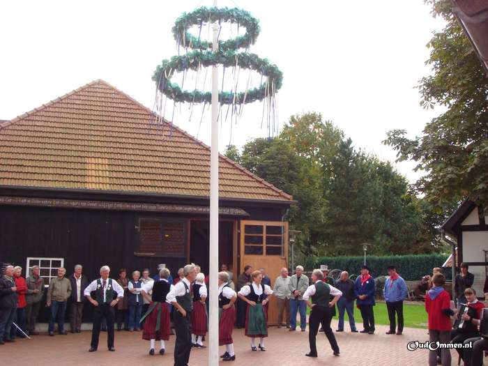 2008. Een Ommer gezelschap te gast in Recke en kijkt toe bij het volksdansen onder de meiboom.