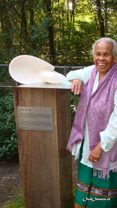 29 september 2012. De toen 81-jarige Hermiena Janwarin-Sedoesboen poseert bij het monument dat herinnert aan het wonen op Woonoord Laarbrug.
