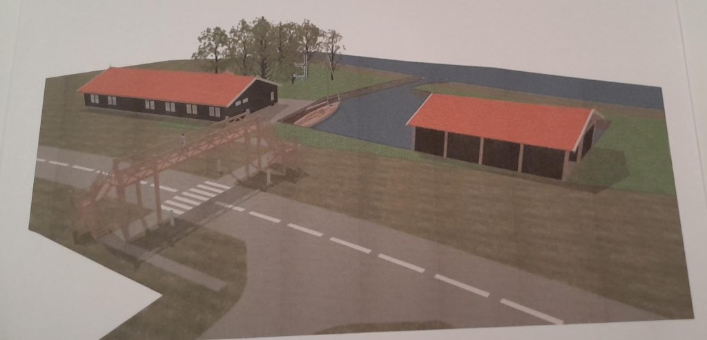 Ontwerpplannen voor de bouw van een nieuw botenhuis voor de Ommer Vechtzomp tussen de molen en de Vecht.