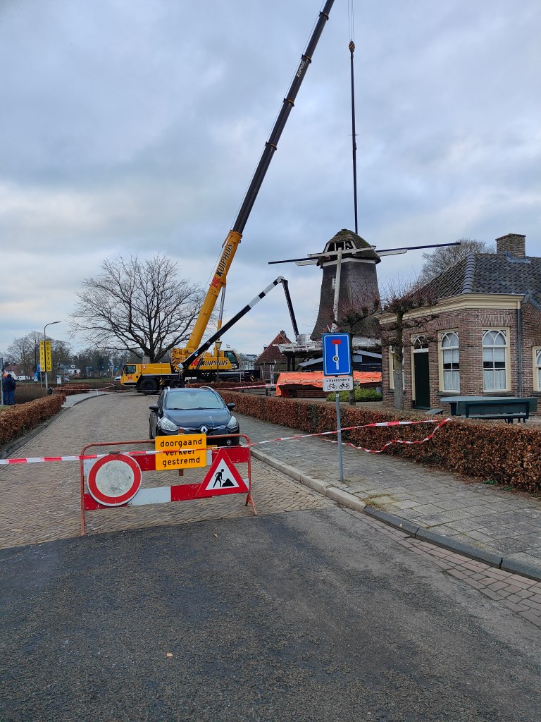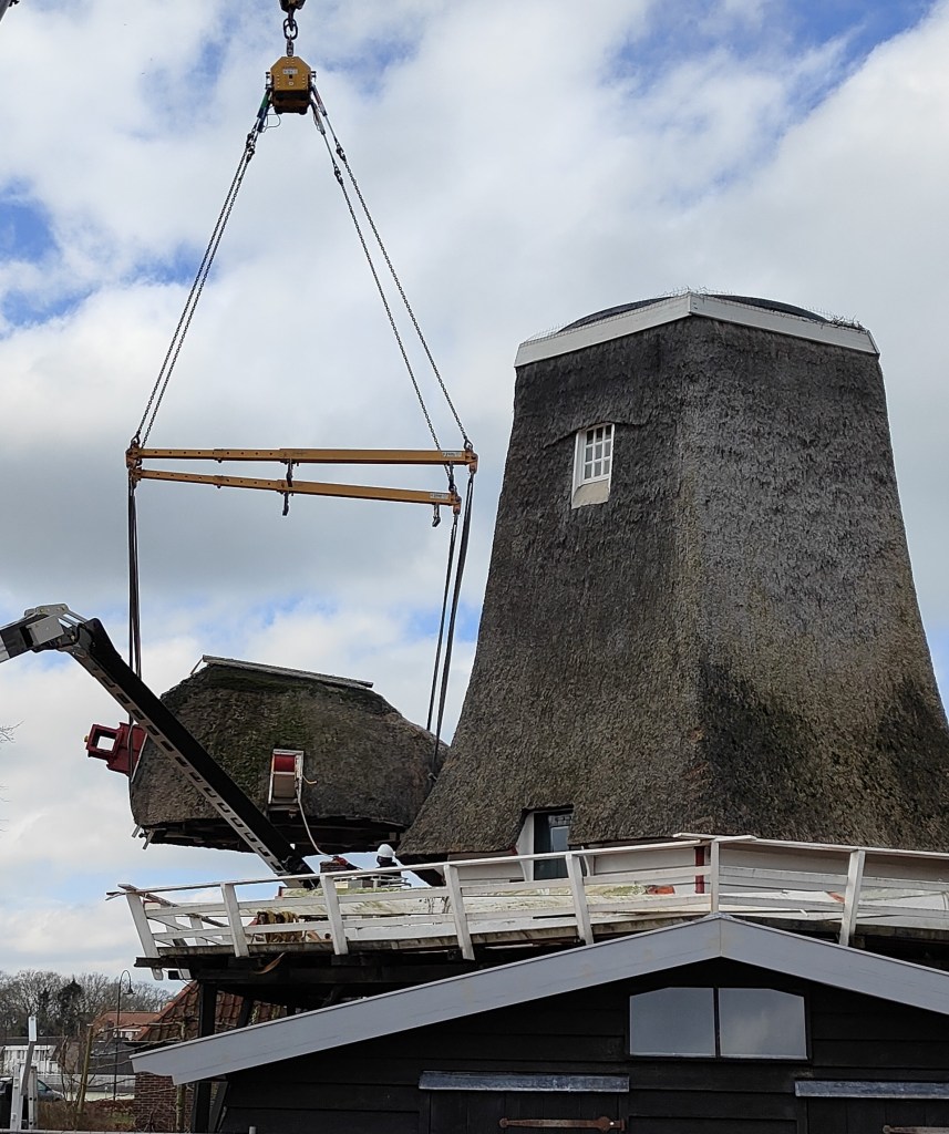 Met uiterste precisie werd vrijdag de molenkap met behulp van een grote hijskraan van zijn plek gelicht en voorlopig naast de molen gelegd. Aanleiding was niet alleen de slechte staat van de rieten kap, maar ook het terugbrengen van de oorspronkelijke functie van de molen: houtzaagmolen. Ook de roeden en de staartconstructie van de molen zijn gestript. Bovendien is het maalwerk uit de molen gehaald. Het lichten van de kap is begin van wat moois om de molen weer de oorspronkelijke zaagfunctie terug te geven en zodoende industrieel- en cultuurhistorisch erfgoed te bewaren.