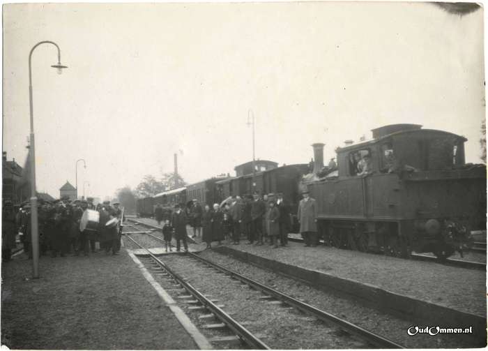 1935. In dit jaar werd de spoorlijn Ommen-Deventer buiten gebruik gesteld. Op de foto de laatste trein die rijdt van het station Ommen via Raalte naar Deventer.