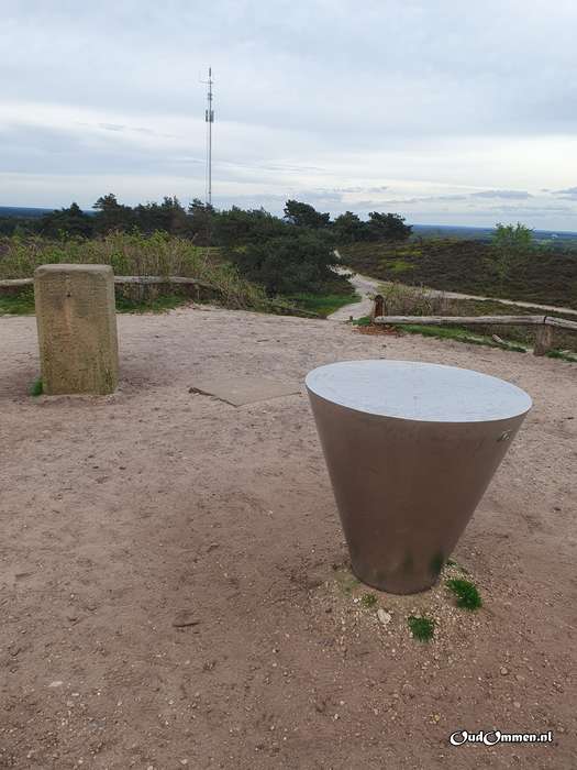 Het hoogste punt van de Archemerberg met de steen van de Rijksdriehoeksmeting en de oriënteertafel. Op de achtergrond is de zendmast zichtbaar.