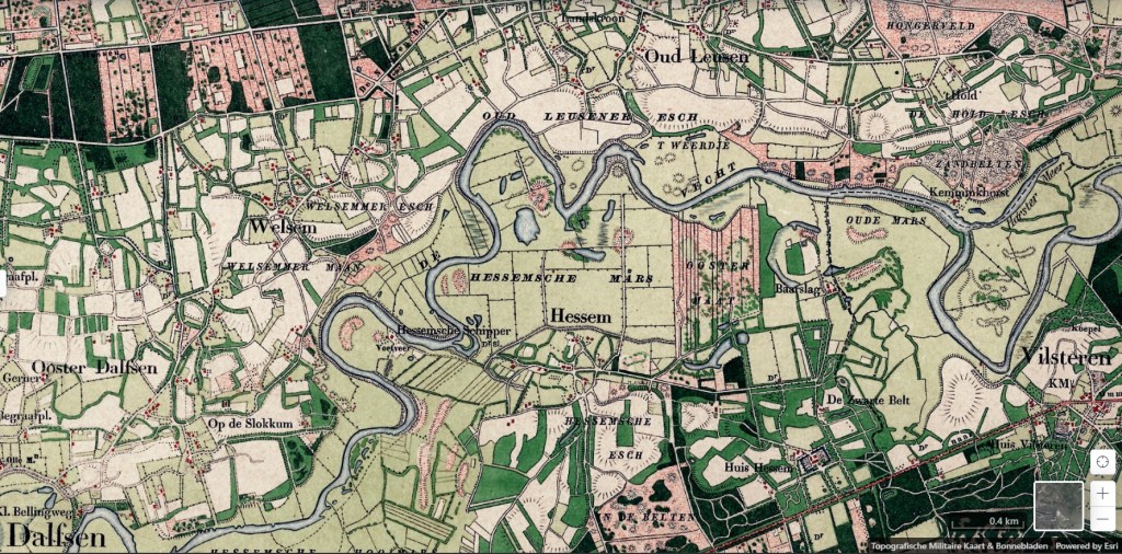 Kaart: Tussen Vilsteren en Dalfsen: Oudleusen en een meanderende Vecht omstreeks 1900 dus vóór de kanalisatie. (bron: Topotijdreis.nl.)