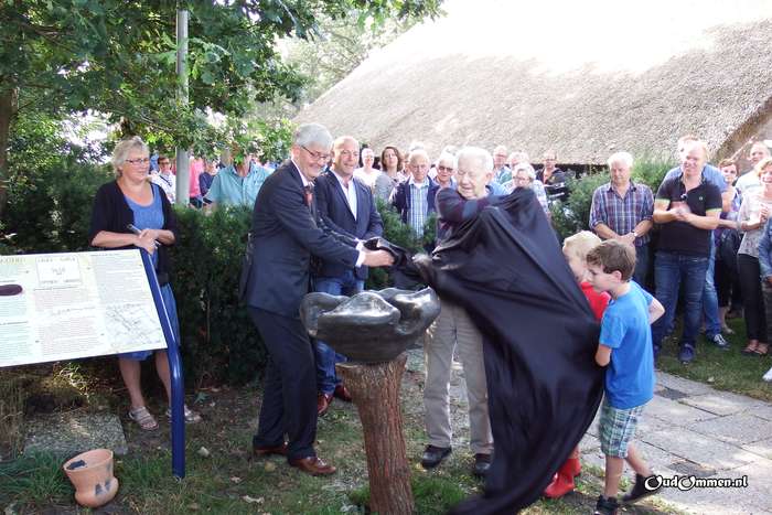 3 september 2016. Onthulling van het kunstwerk. V.l.n.r.: Thea Dijkema, wethouder Ko Scheele, Jan van der Veen en de twee kinderen uit de buurt.