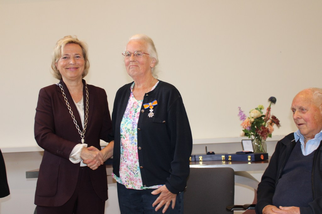 Een lintje en een handdruk voor Leida Bruins-Lemmers van waarnemend burgemeester Annemiek Jetten. Echtgenoot Jan kijkt tevreden toe.