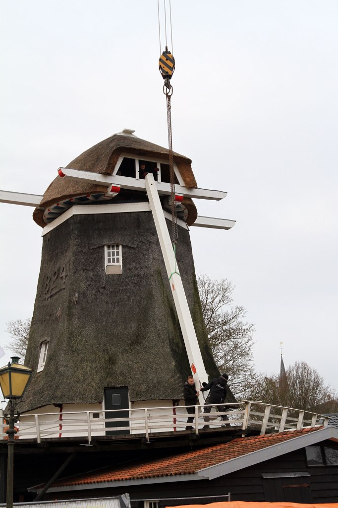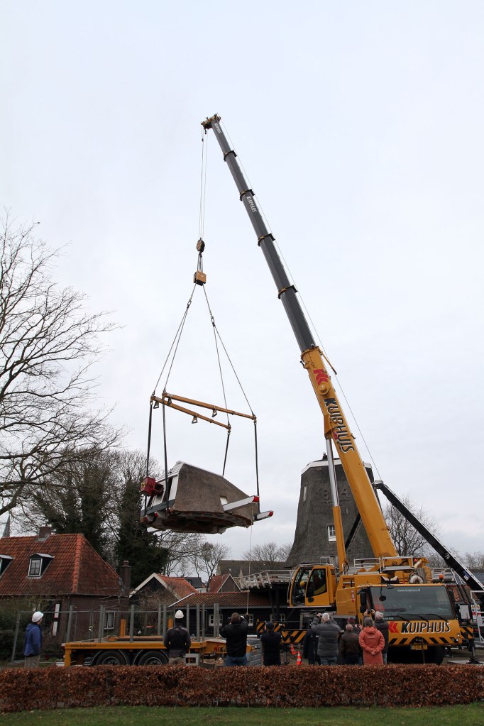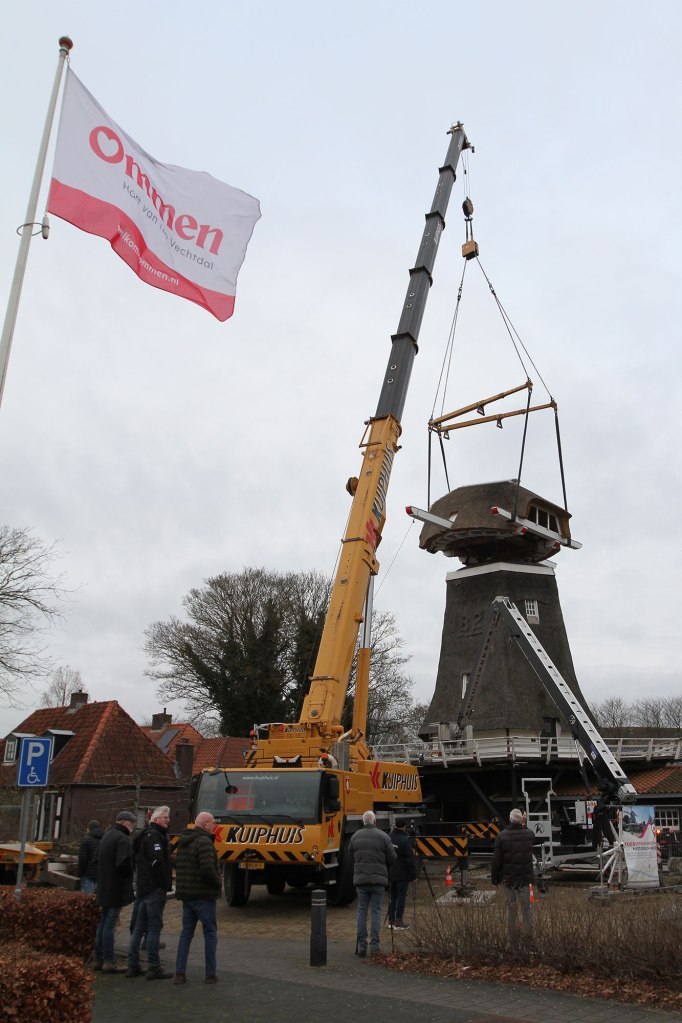 Donderdag 18 december 2025. Het terugplaatsten van de molenkap van ‘Makkinga mölle’.