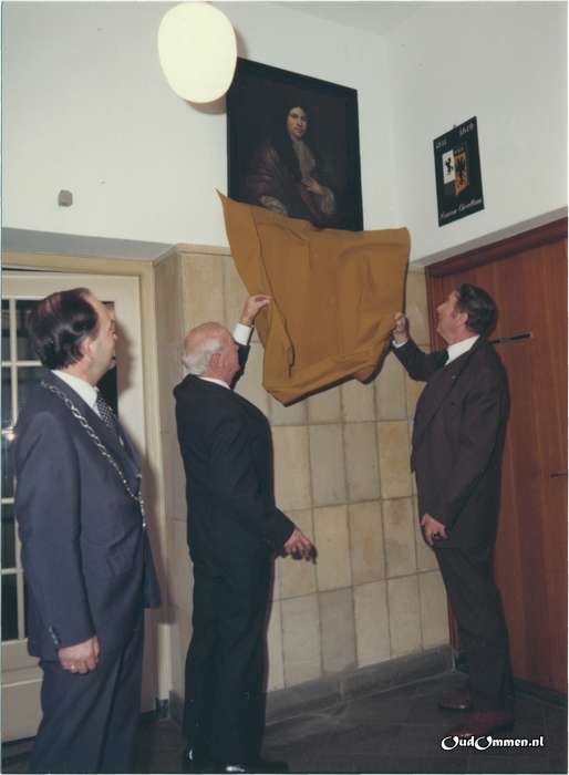 1977. Links burgemeester Carel Knoppers en midden Paulus Wildervanck de Blécourt uit Ommen. Het aangeboden schilderij van Jan Friesendorp wordt onthuld.