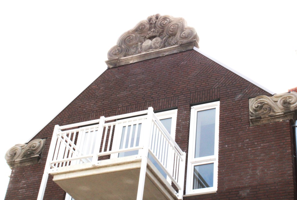 Boveninde gevel van het nieuwe appartement de oude gevelsteen van Friesendorp-Walraven.