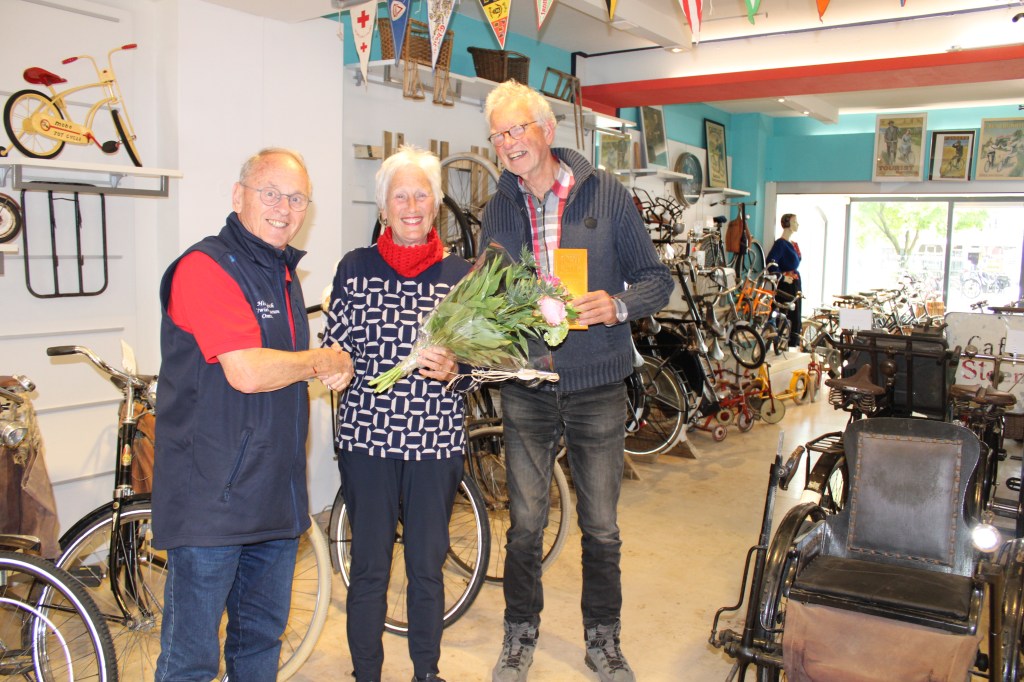 Het waren Hiddo en Teddie Smit uit Nieuwe Pekela, die uit handen van bestuurslid George Doorn bloemen in ontvangt mochten nemen voor dit heugelijk feit. De Groningers kamperen voor het tweede achtereenvolgende jaar op camping De Vos in Lemelerveld. Voor de tweede keer dit jaar bezoeken beiden ook het fietsmuseum. “Een mooi opgezet museum waar de fietshistorie én de fietsen levend worden gehouden”, aldus Smit (76) over het Ommer fietsmuseum. Smit is als vrijwilliger zelf actief bij de Stichting Siep&Co in Oude Pekela waar in een voormalig strokarton fabriek een aantal grote, deels werkende stoom- en dieselmachines van begin vorige eeuw museaal onderhouden worden. “Onze interesse voor het erfgoed is groot. Ze hebben hier een geweldige collectie historische fietsen. Erg mooi om dit te zien en met de uitleg van de vrijwilligers”.