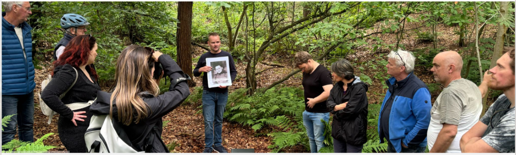 Gids Johan Overweg staat tijdens de fietstoer stil bij oorlogsmonumenten.