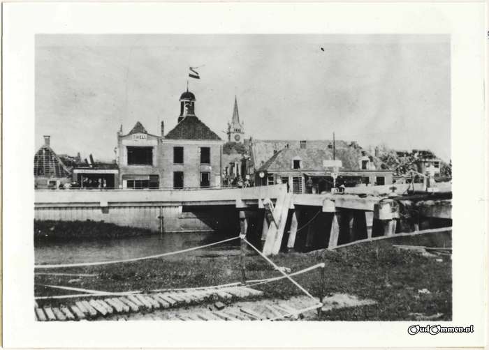 Op een verscheurde foto een deel van de verzetsgroep Stegeren met staand in het midden met baret commandant Jan Nieboer uit Vroomshoop.