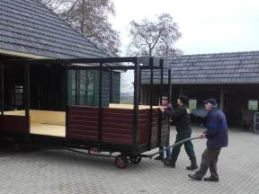 Dankzij de grote schuur van Klaas Stegeman kon het team goed aan de slag, maar nu, twee jaar later, halverwege de restauratie, gaat het huis met schuur e.a. in de verkoop en moest de vereniging op zoek naar een nieuwe locatie. Gelukkig vonden wij opnieuw iemand die de vereniging een warm hart toedraagt. Vandaag is de wagon weer op transport gegaan naar een nieuw onderkomen, om verder te worden opgebouwd. De wagon is nu gestald in de schuur van Jan Schuurman, die zelf ook deel uitmaakt van het restauratieteam. Jan is een gepensioneerd timmerman en dat komt de restauratie zeker ten goede. Er staan de vrijwilligers nog heel wat uren werk te wachten, voor de wagon weer als vanouds de uitstraling heeft die tot de verbeelding zal spreken. De wagon is nu al een stuk erfgoed waar we zuinig op zijn. Wij gaan er daarom een goede bestemming aan geven. De wagon gaat de verbinding tussen het verleden en het heden maken. Helemaal gerestaureerd zal het De Verhalenwagon van Den Hulst en Nieuwleusen worden.
