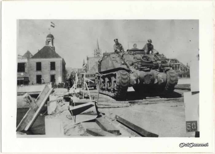 11 april 1945. De bevrijding van Ommen. Een Canadese tank op de beschadigde Vechtbrug.