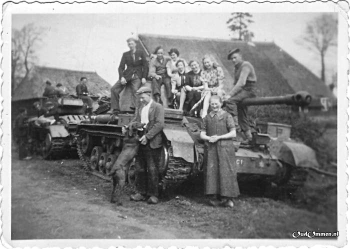 12 april 1945. Varsen bevrijd. Canadese tanks met op de achtergrond de boerderij van de familie Welleweerd aan de Varsenerweg.