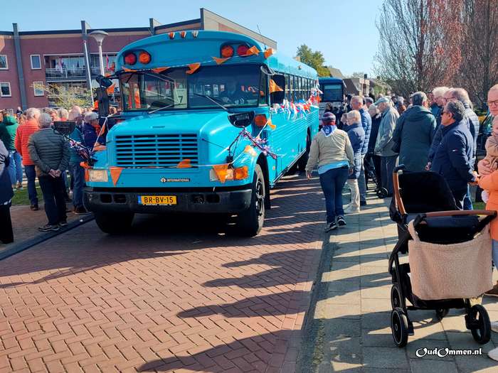 Koningsdag 2023. Met Engelse autobussen werden scholieren naar de aubade bij Oldenhagen gebracht.