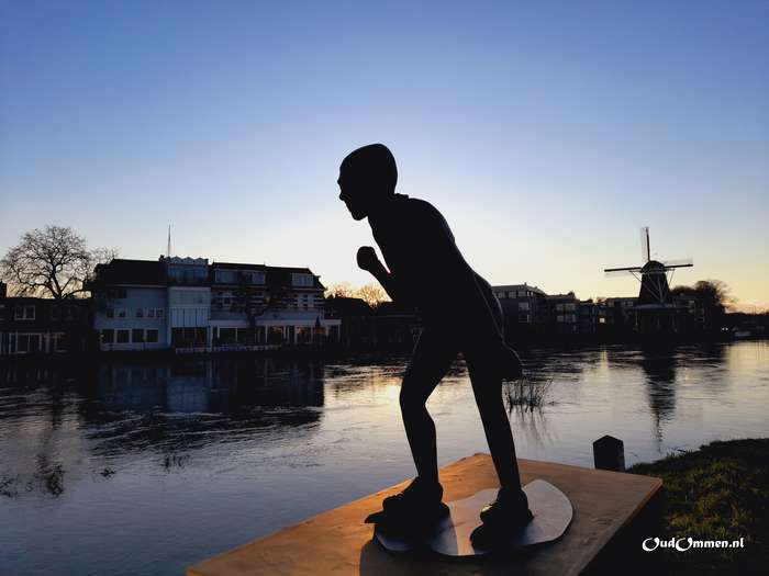 Foto: Het standbeeld van Elfstedentochtwinnaar en oud inwoner van Ommen Reinier Paping (1931-2021) lijkt in het water en op het ijs te staan door de hoge waterstand van de Vecht. Het beeld werd op 15 februari 2013 door Paping zelf onthuld en geeft weer het moment dat Paping over de finishlijn komt in de ‘Hel van ‘63’. Zie voor meer foto’s de albums “2023 – Hoogwater” en “2024 – Hoogwater“.