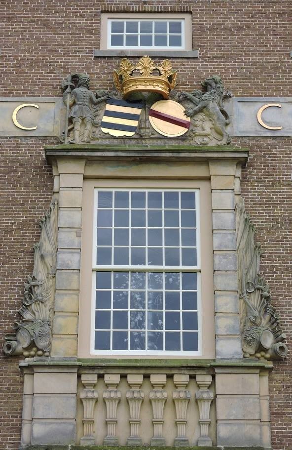 Afbeelding: Het alliantiewapen Van Pallandt-Van Baer boven de ingang van Eerde. Links het familiewapen Van Pallandt (gedwarsbalkt van zes stukken, zwart en goud), vastgehouden door een schildhouder van de Van Pallandts: een man met zwart haar en een baard, die een hellebaard vasthoudt. Rechts het familiewapen Van Baer (in goud een rode schuinbalk), vastgehouden door een leeuw, de schildhouder van de Van Baers. Links en rechts van het raam militaire symbolen die verwijzen naar de militaire loopbaan van generaal Johan Warner des H.R. Rijksbaron van Pallandt: banieren, kanonnen, kanonskogels, trommels, zwaarden, musketten en trompetten.