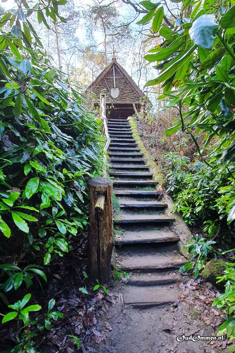 Foto: Vanuit een dalletje met rododendrons via een trappetje naar de kluizenaarshut Zie voor meer afbeeldingen het album “Kluizenaar“.