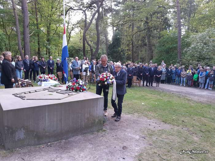4 mei 2024. Rikus van Heerde (rechts) legt als oud-gevangene van Kamp Erika samen met zijn zoon bloemen bij het monument.