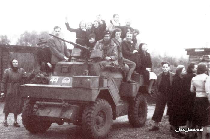 6 april 1945. Bevrijding van Eerde. Op de foto, gemaakt in Eerde, een Scout Car (Lynx) van het Canadese leger met daarop mensen uit Eerde die laten merken dat ze blij zijn met de komst van de bevrijders. Derde van links net achter de loop William Hammer, een neergekomen Amerikaanse vlieger die 7 maanden ondergedoken heeft gezeten bij de familie Van Pallandt. Aangezien de geallieerden nog in opmars waren stond Hammer vanaf dat moment weer onder de krijgstucht en deed mee aan de verdere bevrijding van Nederland. Verder op de Lynx de dames Erin van Pallandt en Irthe van Pallandt. Geheel rechts met hoed is baron van Pallandt zichtbaar.