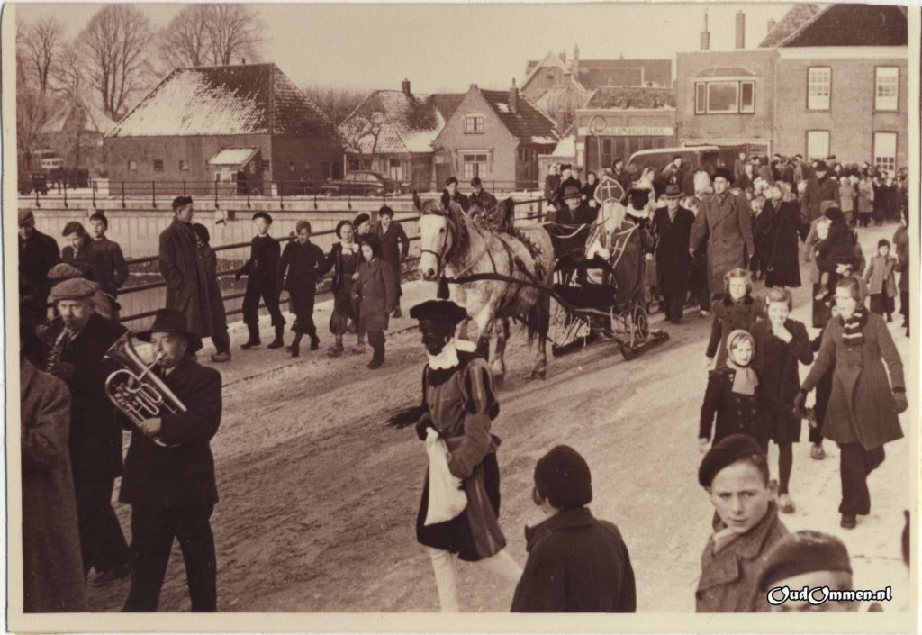 1950. De haven van het in de zestiger jaren van de vorige eeuw gedempte Ommerkanaal. Op de achtergrond molen De Lelie.