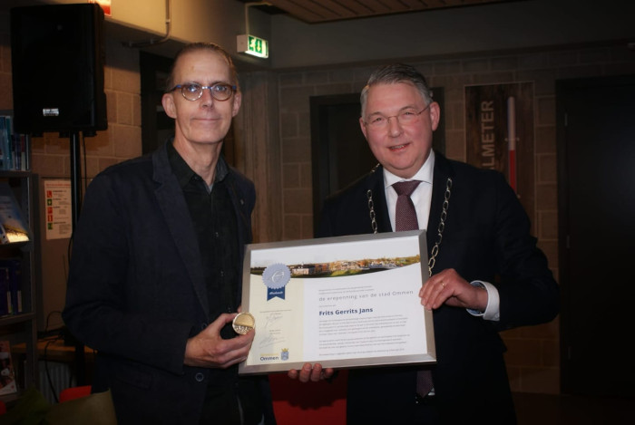 Een erepenning krijg je niet zomaar, daarvoor moet je jezelf ‘jegens de Ommer gemeenschap bijzonder verdienstelijk maken’. Frits Gerrits Jans is bibliothecaris vanaf 1979, en werkt sinds 1985 in de Ommer bieb. Vraag een willekeurige voorbijganger in Ommen wat hij zich herinnert bij het woord ‘bibliotheek’, en het antwoord zal luiden: ‘Frits!’. De afgelopen dertig jaar is elk kind in Ommen opgegroeid met bibliothecaris Frits. Hij is een vraagbaak voor iedereen, het geheugen van de bibliotheek, makkelijk benaderbaar, iedereen is gelijk voor hem, niemand klopt tevergeefs bij hem aan voor hulp en informatie.